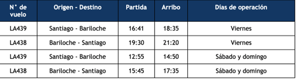• A partir del 8 de diciembre, LATAM Airlines reanudó sus vuelos sin escalas entre Santiago de Chile y la ciudad de Bariloche en Argentina con 3 frecuencias semanales de diciembre a marzo.