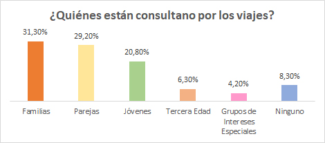 - Las familias son las que más están consultando sobre viajes, marcando un 31,3%, seguidas por parejas con un 29,2% y, en tercer lugar, jóvenes que representan un 20,8%. Un 8,4% de las empresas que respondieron manifestaron no haber recibido consultas.