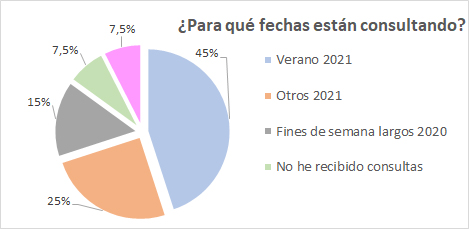 - La mayoría de las consultas y cotizaciones que reciben las empresas (45%) son para viajar durante el verano de 2021, mientras que solo un 15% es para fines de semana largos de este año.