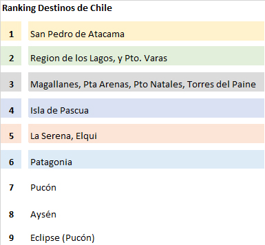 - En el ranking de destinos nacionales San Pedro de Atacama está en primer lugar, seguido por la Región de los Lagos; Magallanes con Punta Arenas-Puerto Natales y Torres del Paine está en el tercer puesto e Isla de Pascua en el 4°lugar. Menos consultas se han recibido para visitar La Serena-Valle del Elqui, Pucón y Aysén. El eclipse propiamente tal, para ser observado en Pucón ocupa el último puesto.