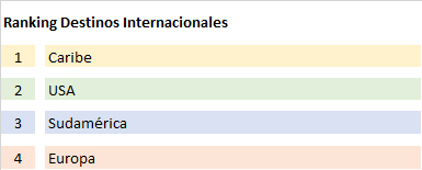 - En el ranking de destinos internacionales el Caribe ocupa el primer lugar, seguido de Estados Unidos y Sudamérica, en el tercer lugar.