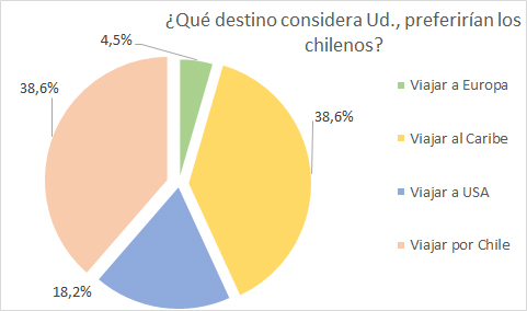 - En la consulta, “si las condiciones de apertura de fronteras logran concretarse para el verano 2021, ¿Qué destino considera Ud., preferirían los chilenos?, las respuestas ubicaron a Chile y Caribe en el primer lugar con un 38,6%, Estados Unidos figura como segundo con un 18,2% de respuestas y luego Europa con un 4,5%