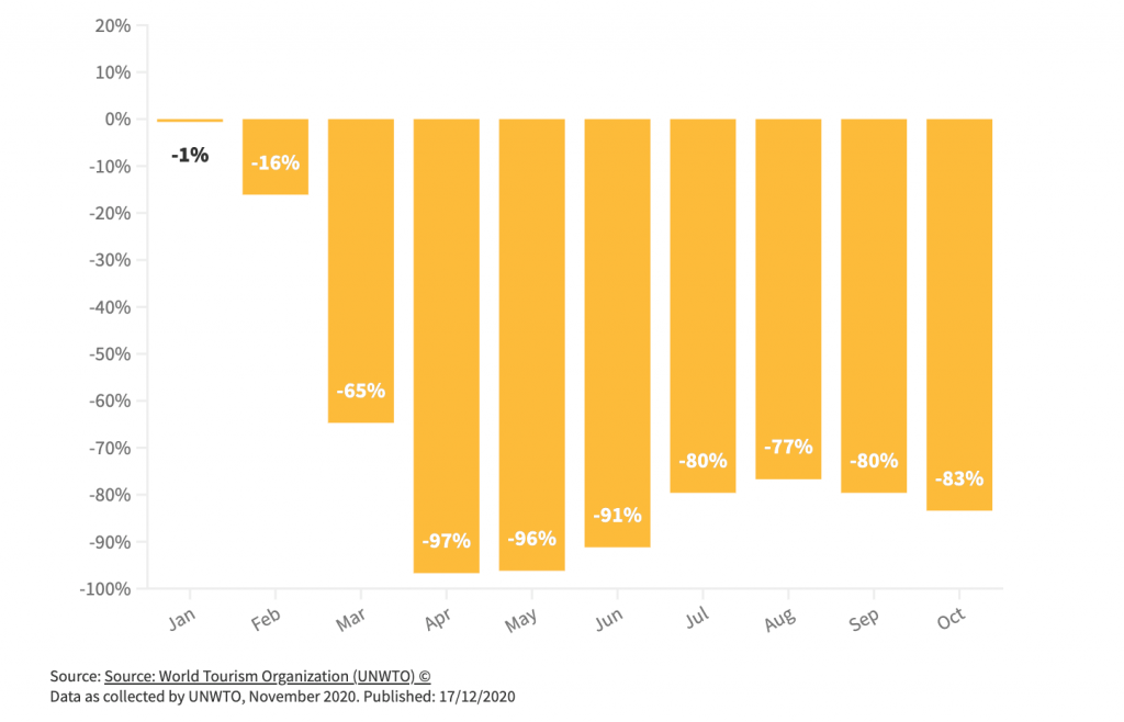 Según datos recientes de la Organización Mundial del Turismo (OMT), los destinos recibieron 900 millones menos de turistas internacionales entre enero y octubre, frente al mismo periodo de 2019. Esto se traduce en una pérdida de 935.000 millones de dólares estadounidenses en ingresos por exportaciones del turismo internacional; pérdida diez veces superior a la que se produjo en 2009 como consecuencia de la crisis económica mundial.