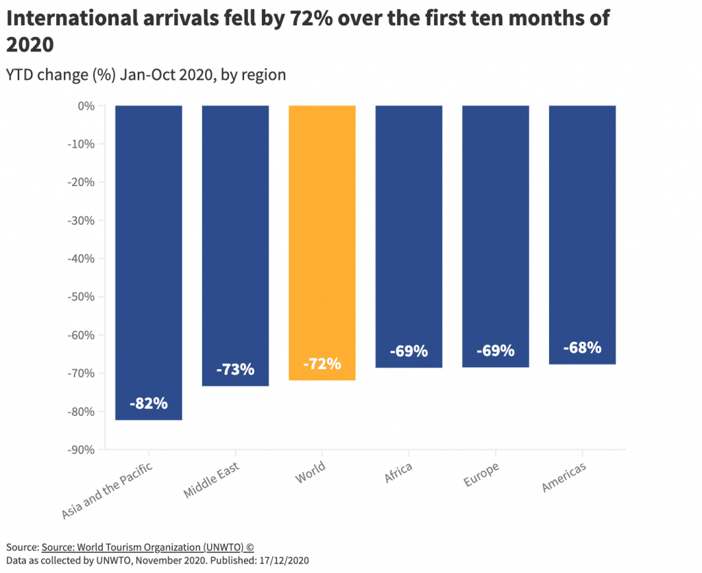 Las llegadas internacionales cayeron un 72% en los primeros diez meses de 2020, con las restricciones a los viajes, la poca confianza del consumidor y la lucha mundial por contener el virus de la COVID-19, todo lo cual contribuyó al peor año que se haya registrado en la historia del turismo.
