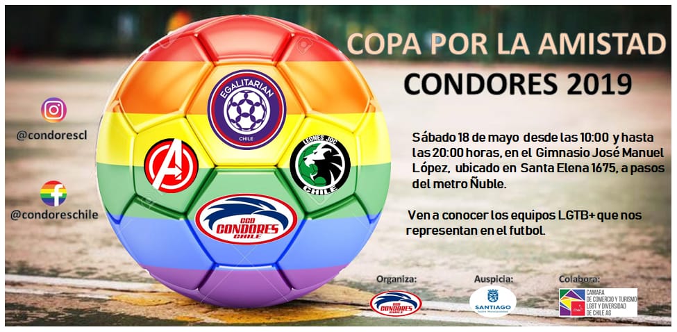 El sábado 18 de mayo se realizará la «Copa por la amistad cóndores 2019» donde se enfrentaran 5 equipos de futbol LGBT+ de Santiago de Chile.