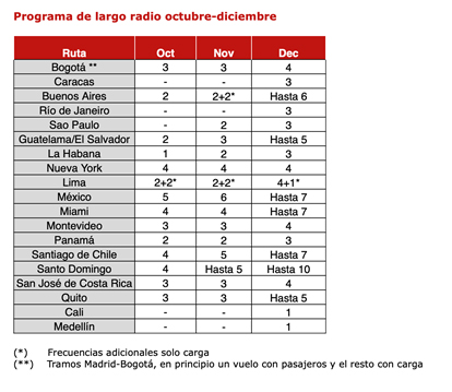 • Colombia, incrementa su oferta con Bogotá hasta cuatro frecuencias semanales y, en diciembre, operará una frecuencia semanal con Cali y otra con Medellín.