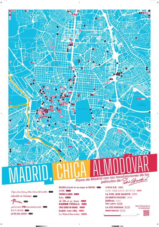 Madrid, septiembre 2024.- El Ayuntamiento de Madrid ha lanzado el mapa Madrid, chica Almodóvar, publicado por Ocho y Medio Libros de Cine y patrocinado por Madrid Film Office, oficina del audiovisual del Ayuntamiento, que suma la elaboración de este mapa a su línea de acciones de divulgación del patrimonio audiovisual madrileño. El mapa, que recoge 272 localizaciones madrileñas de las 23 películas del director Pedro Almodóvar, se ha diseñado como un objeto de colección en el contexto de la exposición homónima que se celebra en la sala municipal del Centro Cultural Conde Duque hasta el 20 de octubre, y se puede adquirir en la Librería Ocho y Medio, la tienda del Centro de Turismo de la Plaza Mayor y otros puntos de venta. Algo así como el mapa del tesoro de los cinéfilos que han podido ver las películas de Almodóvar, quien indiscutiblemente ha marcado un estilo en el cine español.