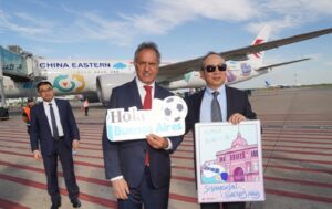 Buenos Aires, diciembre 2025.- El secretario de Turismo y Ambiente de la Nación, Daniel Scioli, asistió a la recepción e inauguración del vuelo inaugural de la ruta Shanghái-Auckland-Ezeiza, operado por la compañía China Eastern Airlines. Así se dio inicio a la primera conexión regular comercial entre China y Argentina, con dos frecuencias semanales, que corrobora el rumbo trazado por el gobierno hacia la creación de nuevas rutas, más turismo y mayor actividad económica.