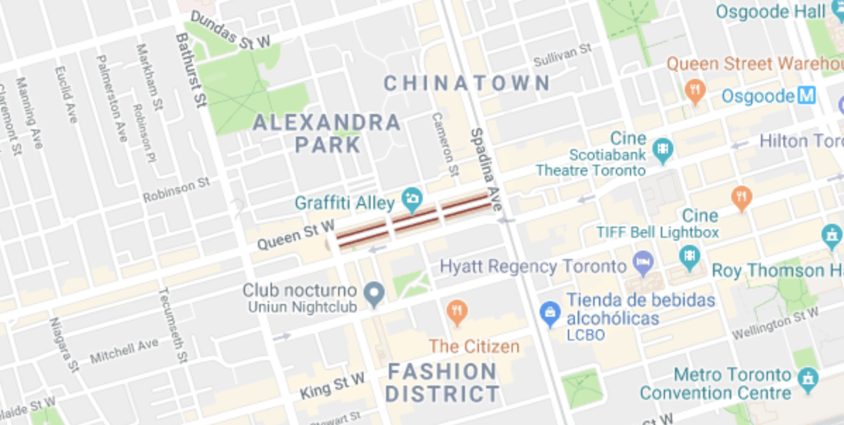 Es un lugar que por sus colores, sus dibujos, te van a sorprender; en si es un nuevo look que adorna las calles y lo hace encantador, está ubicado en Queen St W, On Rush Lane.